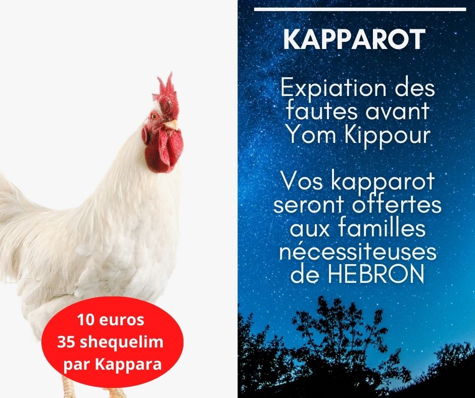 Avant le jour de Yom Kippour, il est coutume d’accomplir une expiation symbolique  de nos fautes et de celles de nos enfants. Ce rite s’accomplit en faisant tourner un poulet trois fois au-dessus de sa tête en récitant le texte approprié.  Nous demandons à D.ieu que, dans le cas où nous étions destinés à être l’objet de cruels décrets, puissent ceux-ci être transférés sur ce poulet par le mérite de la mitsva de charité.